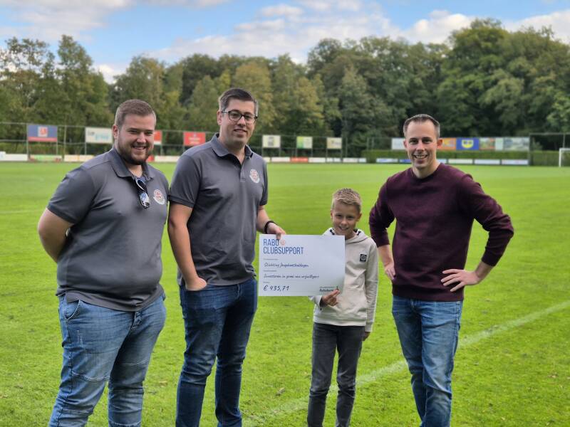 Gisteren kregen we uit handen van de Rabobank een cheque met daarop het opgehaalde bedrag tijdens de Rabo Clubsupport-actie. We hebben liefst € 435,71 opgehaald met de actie. Een prachtig bedrag waar we héél erg blij mee zijn. We willen via deze weg iedereen bedanken die op ons heeft gestemd. Mede dankzij dit bedrag kunnen we het inschrijfgeld voor de Jeugdvoebaldagen zo laag mogelijk blijven houden.